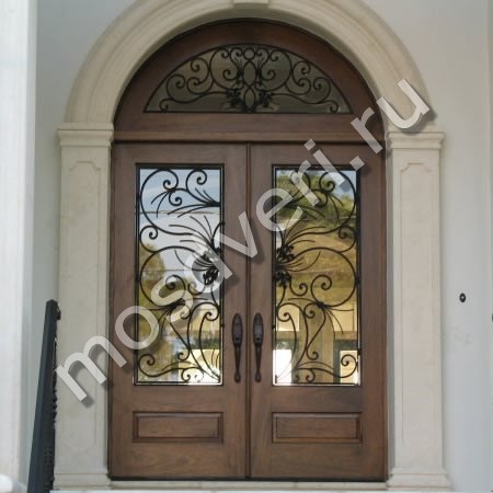 • с фрамугой прямоугольной формы со встроенной вставкой из стекла в виде полукруга.